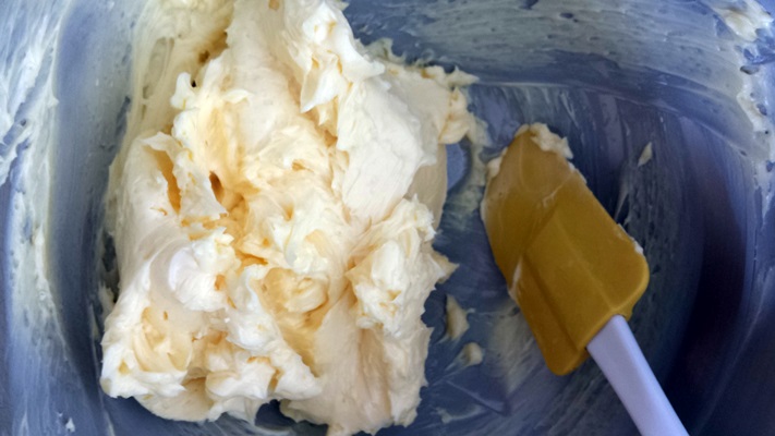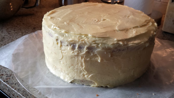 After all the steps were completed (the photos omit the lemon syrup, cutting of the layers, etc.) I was ready to frost. And the amount of lemon buttercream was simply not enough for me to cover the entire cake, and the crumbs were an issue. In the end, this was my sad result: