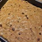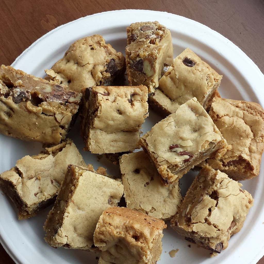 I should stress that these are not your standard “chocolate chip cookie bars”. They have rich, brownie-like texture and a depth of flavor from brown sugar/toasted pecan combination that’s not found in a basic toll-house.